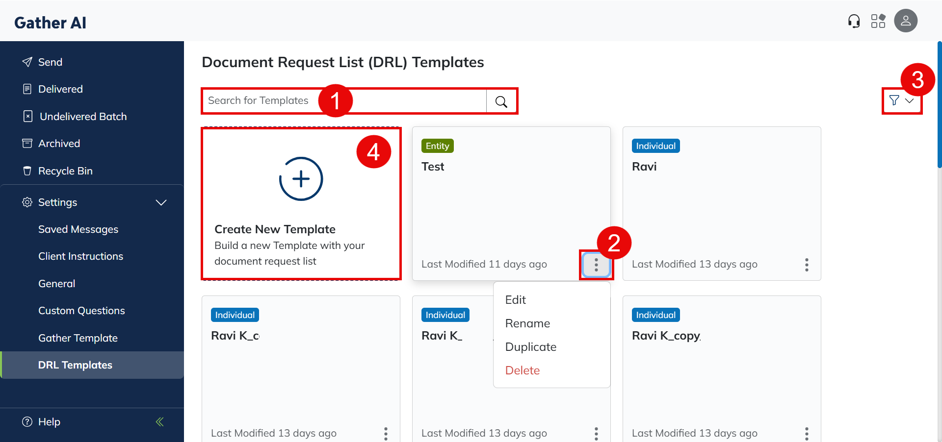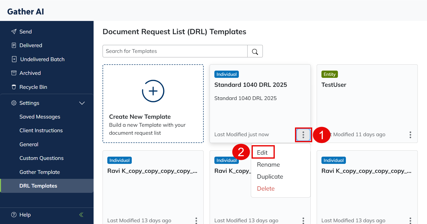 Templates are pulled from the Settings: DRL Template section. These can be used instead of the AI-generated document request list.
