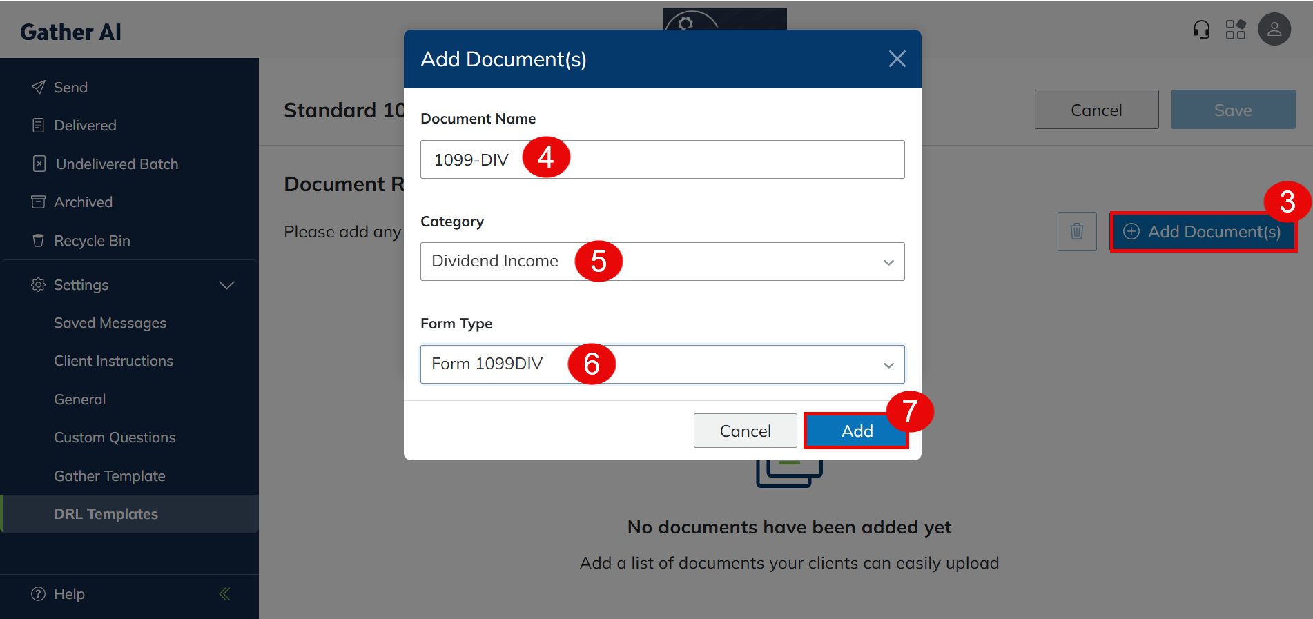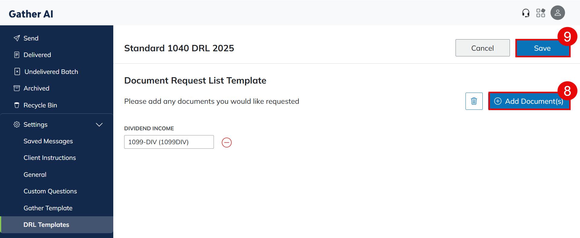 Gather generates Document Request Lists based on the content of the uploaded organizer. These generated lists can be edited during processing or a template can be used instead. The Document Request List can also be edited after the request is delivered.