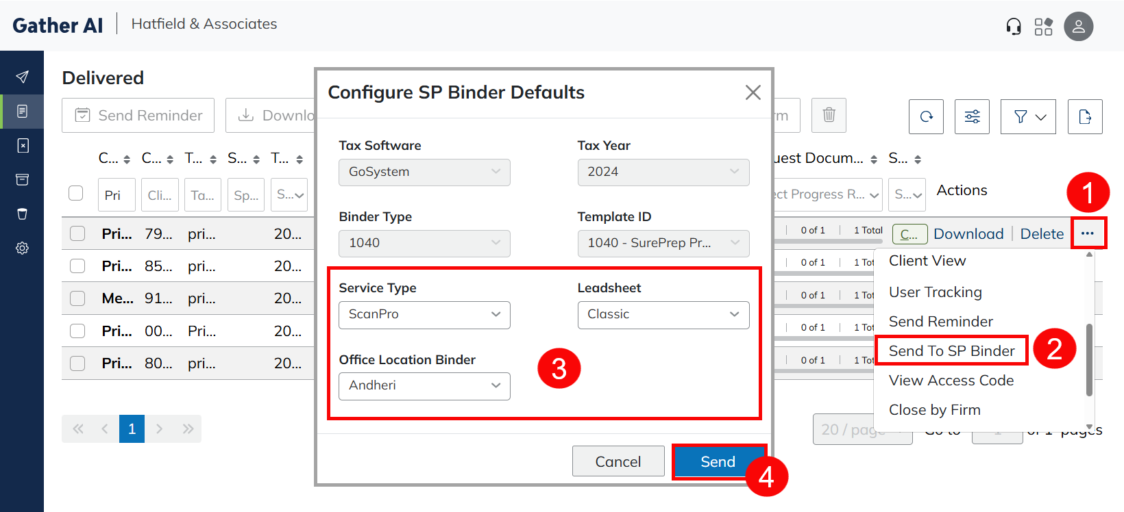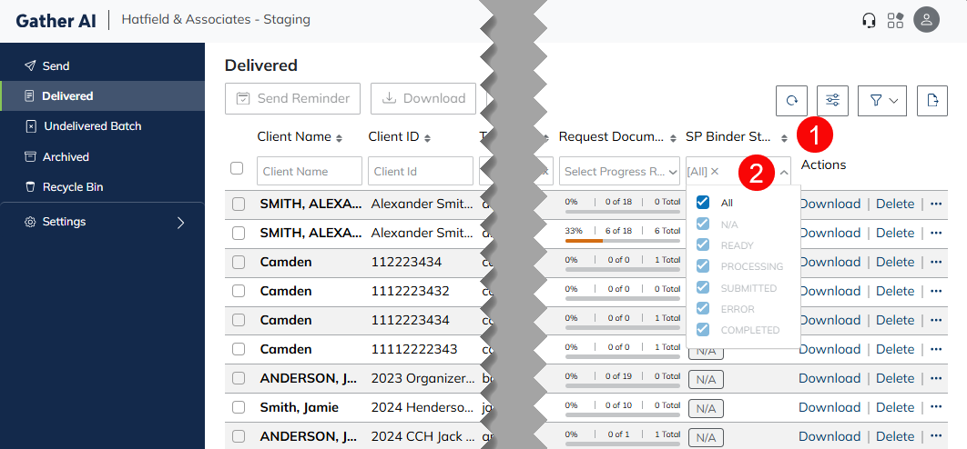 Client documents can be sent to SPbinder from the Delivered Gather dashboard.